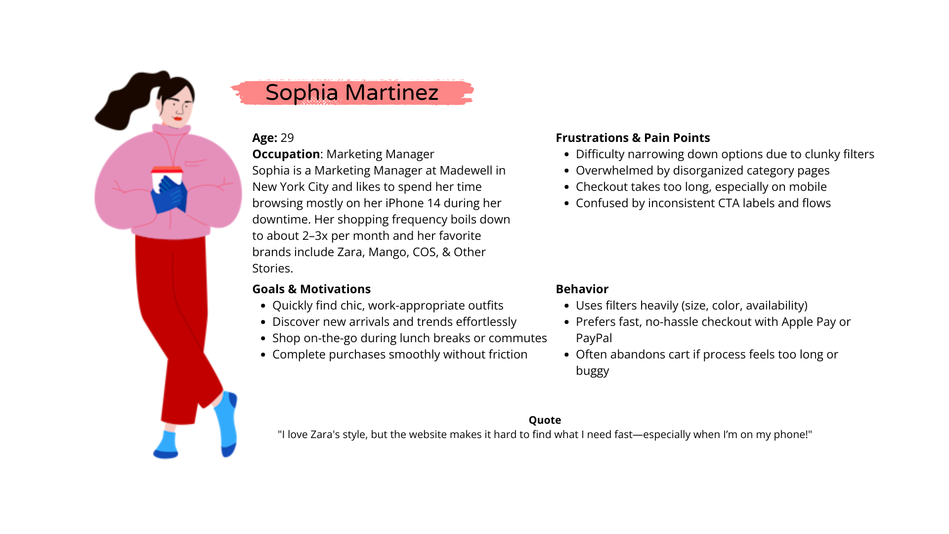 Zara is a globally recognized fashion brand with a strong online presence. Users commonly report issues such as poor navigation, lack of intuitive product discovery, slow loading times, and a checkout process that is not streamlined. These issues can frustrate users and lead to high bounce rates, cart abandonment, and lost sales.