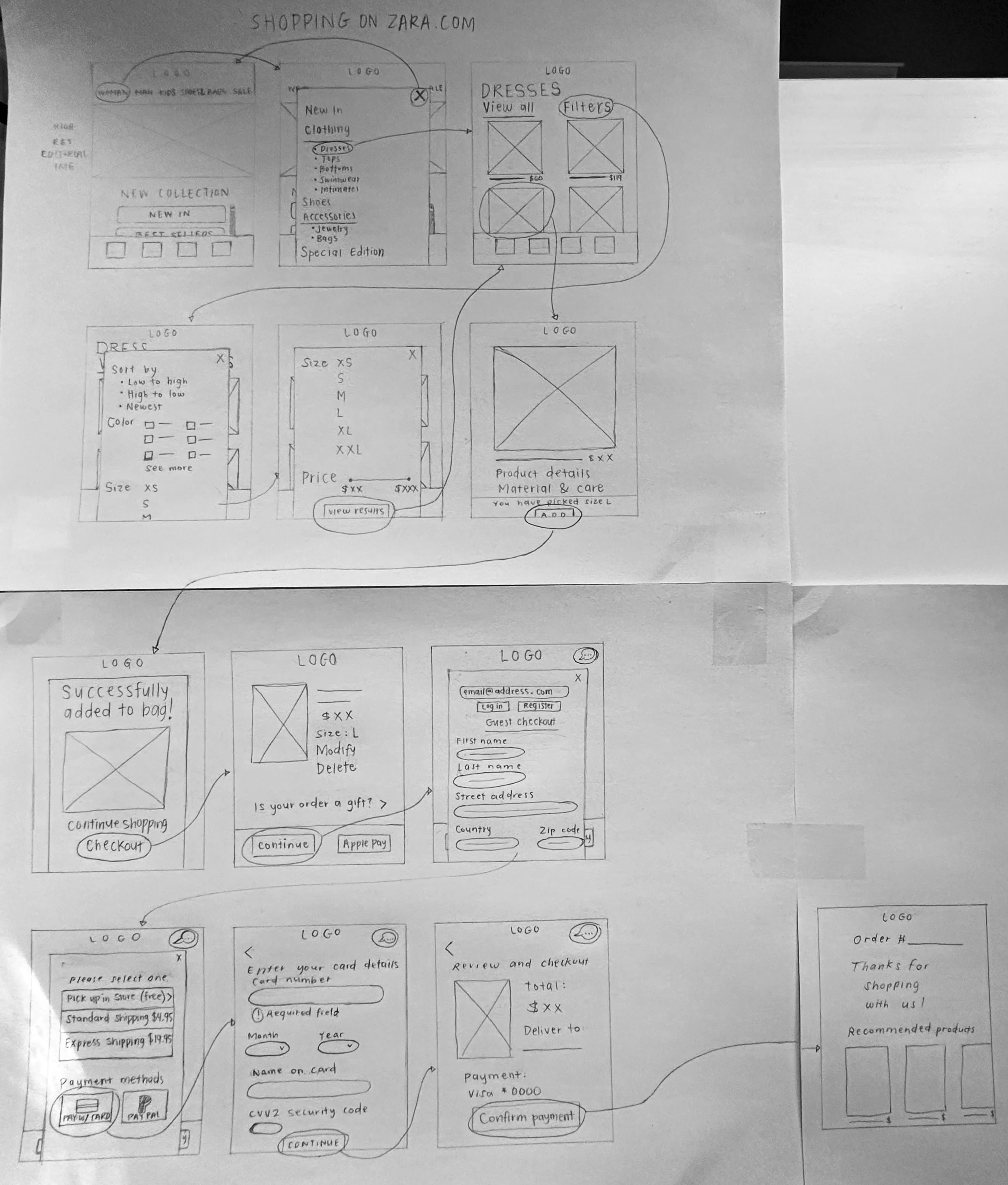 As an example of a user’s shopping experience, I constructed a user flow diagram, mapping out the experiences of a user browsing and filtering for a size L, inexpensive black dress, then adding the item to their shopping cart and completing the checkout process.